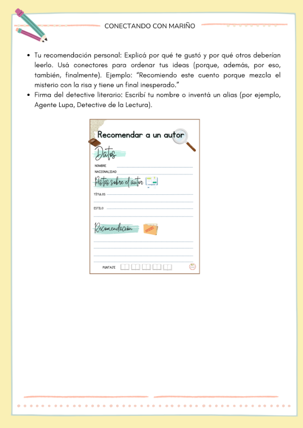 Además, el cierre invita a escribir recomendaciones de autor con estilo: tarjetas de detective en las que los alumnos comparten sus lecturas y recomiendan escritores como verdaderos agentes literarios.