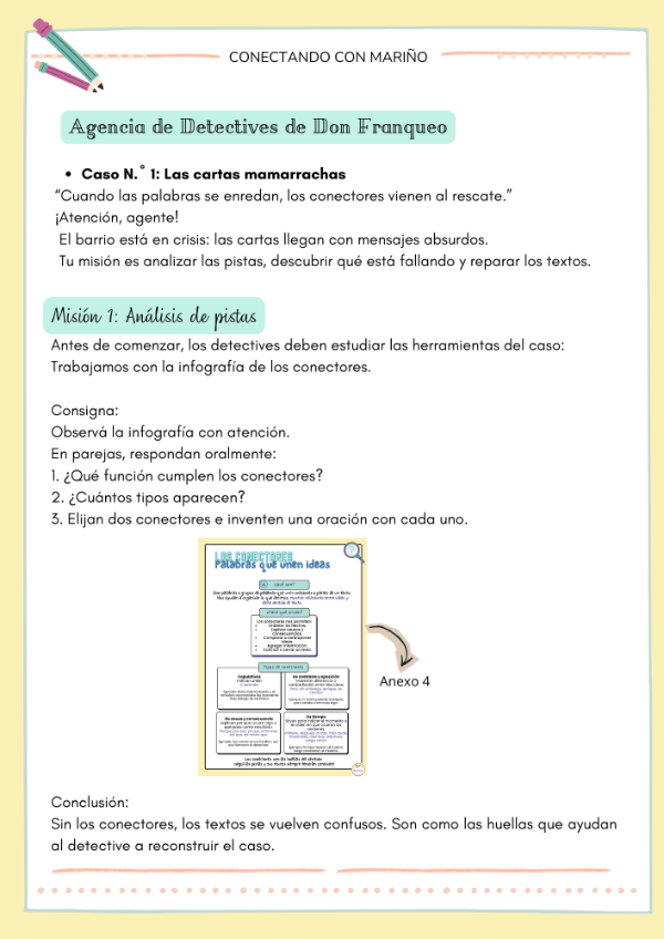 Un recurso pensado para transformar la enseñanza de los conectores en una misión detectivesca llena de intriga y creatividad.