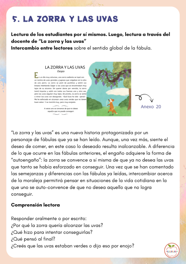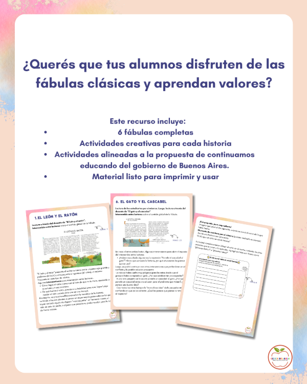 Este material incluye 6 fábulas clásicas cuidadosamente seleccionadas para acompañar los bloques 1 y 2 del diseño curricular de la Provincia de Buenos Aires, con propuestas pedagógicas que abordan la comprensión, la producción escrita, la oralidad y la reflexión.